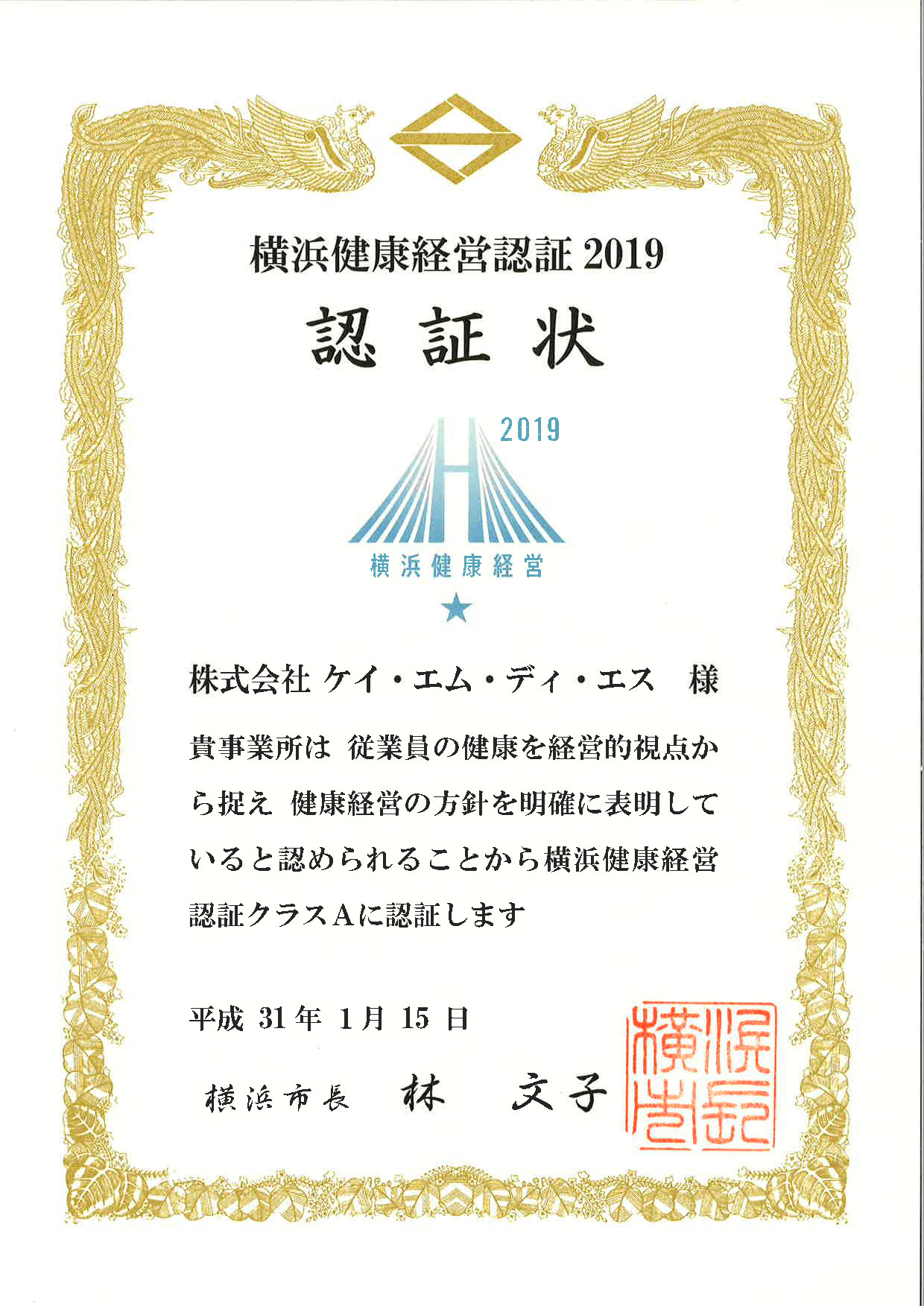 当社はこのたび、横浜市による横浜健康経営認証「クラスA」に認証されました。経営者による健康宣言が明文化され、社員の健康維持のための具体的な取り組みをおこなっていることが評価されました。今後さらに取り組みを進化させながら、社員の健康維持により一層努めて参る所存です。 FacebookXBlueskyHatena